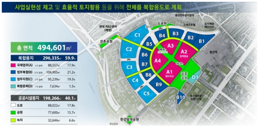 용산국제업무지구는 최고 100층 높이의 랜드마크 건물을 포함한 글로벌 비즈니스 허브로 개발됩니다. 이를 위해 일부 구역은 한국형 화이트존인 ‘도시혁신구역’으로 지정되며, 최대 용적률이 기존 1000%에서 1700%로 상향됩니다. 이를 통해 고밀복합개발을 유도하고, 용산이 가진 정치, 경제, 문화적 기능을 강화하여 상징적인 도시 공간으로 자리 잡을 계획입니다.