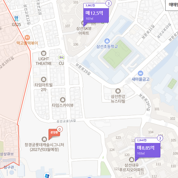 인근 단지인 삼선푸르지오(2008년 준공)의 전용 84㎡는 최근 8억 5,000만 원에 거래되었으며 고층 기준 최근 호가는 8억 8,500, 삼선SK뷰(2012년 준공)의 전용 84㎡는 11억 5,000만 원에 거래되었으며 고층 기준 최근 호가 12.5억입니다.