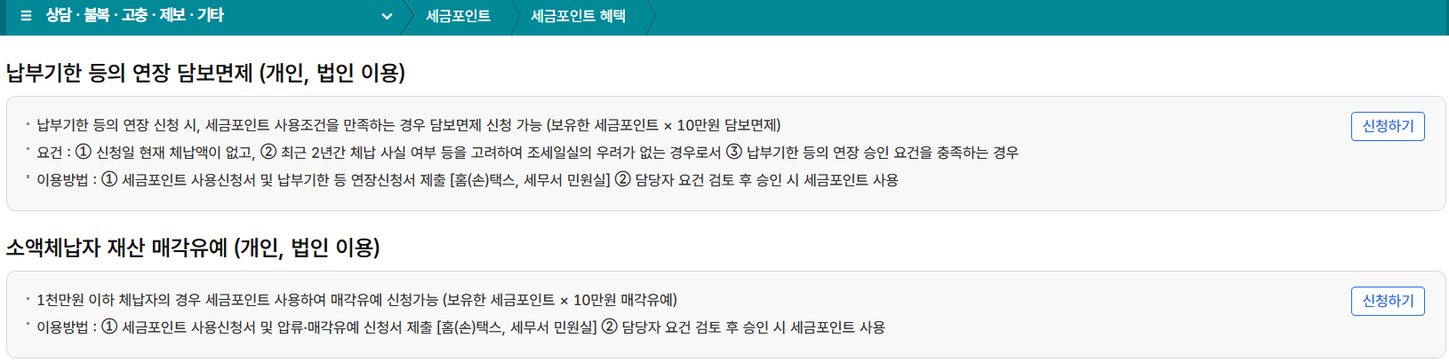 • 법인은 신고 및 납부 과정에서 포인트가 적립되며, 개인은 성실 납세 여부를 추가로 고려합니다.